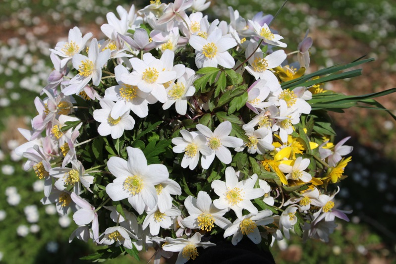 Trots den bistra vinterkylan som ihärdigt håller sig kvar på natten så står de vackra små sipporna där i skog och mark. Härom natten hade vi nästan fem minusgrader på morgonen de sista nätterna har de hamnat på ett par minus. Så det gäller att passa på att njuta av de strålande soldagarna även om vinden kan kännas lite kylslagen. Det som ändå lyser upp dagen är vit -och blåsipporna som uti backen står. I går plockade jag första buketten och satte in den i en liten vas, då får man verkligen lite vårkänslor.