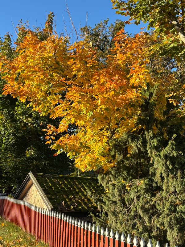 Vilken härlig höst vi har haft, färgsprakande träd överallt som nu sakta dalar ner på marken. Nyponen lyser illröda för att förstärka de varma färgerna på färgskalan. Vår älskade brygga är upptagen och står nu på torra land och bara vänta på att få bli ett med havet igen nästa år. Tack Anna och Jonas för ert engagemang och era insatser, i år är vi dåliga att hjälpa till att skrapa av olika anledningar men vi kommer igen till nästa år. Det som skiljer höst från jul eller kanske överlappar är att julhandeln är i full gång, tomtar och julpyssel fullkomligt bågnar i affärerna, ja ja det går fot tills tomtarna skall fram till dess njuter vi av höstens magiska färger.