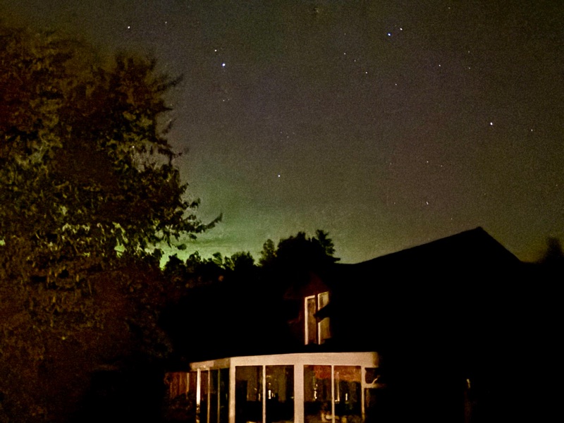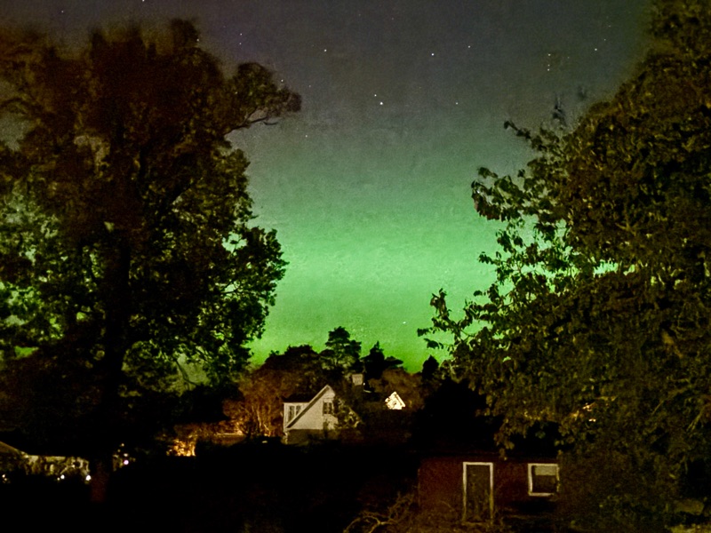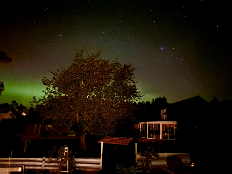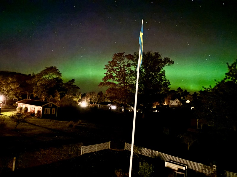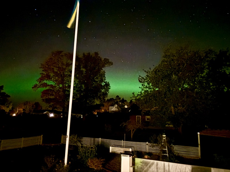 Temperaturen sjönk med ett par grader och stjärnorna visade upp hela sitt register på himlavalvet, då får vi ett mess från sonen - norrsken nu. Mycket riktigt där långt bort i norr spelar det magiska gröna ljuset över himlen, så hade vi varit längts upp på norra Öland fritt från all bebyggelse eller kanske utmed den Östra kusten så hade nog vyn varit i magisk. Det var helt vindstilla och så där härligt krispigt som det är när temperaturen sjunker. Vi tog iallafall på oss och gick ut på spaning och fick väl ett par ok foto. Det är något visst med det där gröna ljuset som dansar runt bland Karlavagnen och Orions bälte.