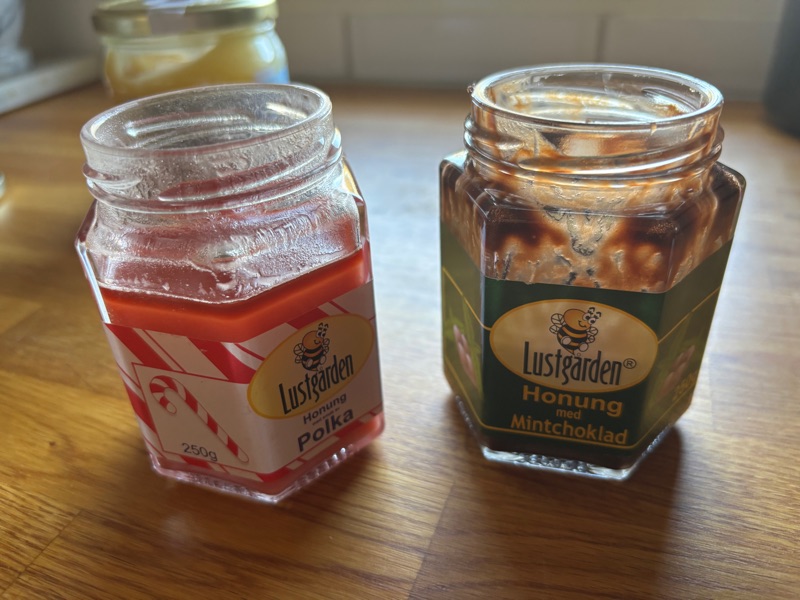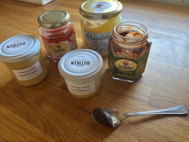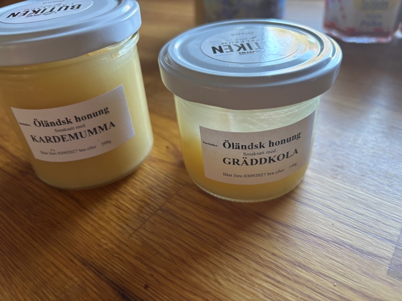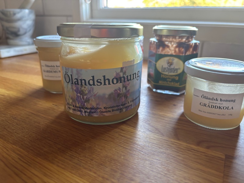 Alla vet vi såväl att honung är naturens egen sötma som är fylld av gyllene energi. Den lugnar halsen vid förkylning och lindrar hosta på ett milt sätt. Den ger huden lyster och kan användas i både te och hudvård. Honung innehåller antioxidanter som stärker kroppens försvar. Den är ett naturligt alternativ till raffinerat socker. Ett par droppar i teet sprider värme och ro i kroppen. Biets arbete bakom varje droppe gör honungen ännu mer värdefull. Kort sagt – honung är både hälsa, njutning och natur i sin renaste form. Varje Skördefest här på Öland alternativ varje julmarknad låter jag mig övertalas om nya smaker på honung så nu har jag mintchokladhonung, polkahonung, gräddkolahonung och kardemummahonung. Där och då smakar det ljuvligt men väl hemma blir de mest stående på hyllan och jag återgår till min leverantör utanför knuten Markström honung- men vist blir ni lite sugna på att prova gräddkolahonung?