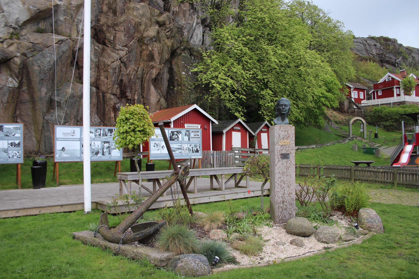 På vår resa på Västkusten hade vi tänkt att kunna strosa runt i Fjällbacka. Vi skulle följa strandpromenaden med utmed kajen. Tyvärr stod regnet som spö i backen och det blev ett kort stopp i den här metropolen. Vi kunde i alla fall se det 74 meter höga Vetteberget som ligger i stort sett mitt i byn. Nedanför Vetteberget står en staty av vår kanske mest framträdande skådespelare nämligen Ingrid Berman. Ingrid Bergman blev Fjällbacka trogen, varje sommar besökte hon det lilla paradiset fram till sin död. Efter att ha trängts med ett busslasts fotograferande Japaner, åkte vi vidare till Hamburgsund, Hunnebostrand och Sotenkanalen, några riktigt vackra pärlor ibland de kala vindpinade kobbarna. Summa samarium över de som Göteborgarna kallar ”Bästkusten” är att det finns otroligt vackra pittoreska skärgårdssamhällen, men ”Solen och Vindarnas Ö” slår nog det mesta. fast jag kommer gärna tillbaka till Västkusten.