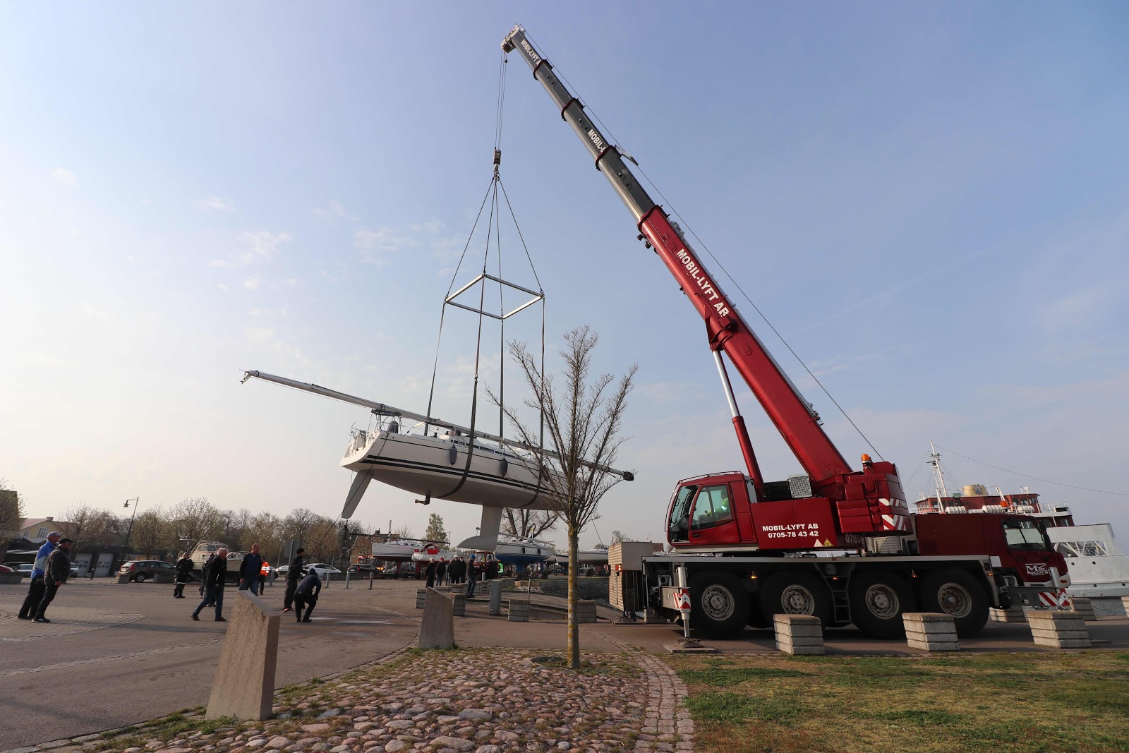 Det skulle blivit 22 grader kanske till och med på gränsen till 25 grader. Det blev en dag med 15 grader och rejäl vind från nord med allt vad nordan innebär. Men nu är det inte vädret som avgör om det skall bli sjösättning eller inte. Strax innan klockan åtta var lyftkranen på plats nere på hamnplanen i Färjestaden. Tjugotre båtar skulle ner i sitt rätta element och minst lika många entusiastisk kaptener trotsade blåsten iklädda mössa och vantar. Det här året hade vi tur och kunde lägga i som nummer två vilket gjorde att det är även blev tid till mastsättning. Sonen är som vanligt en klippa och styr upp hela processen och i år fick kapten även sällskap av minikapten som höll hårt i tamparna och ratten när det väl var dags för förflyttning till bryggplatsen.
