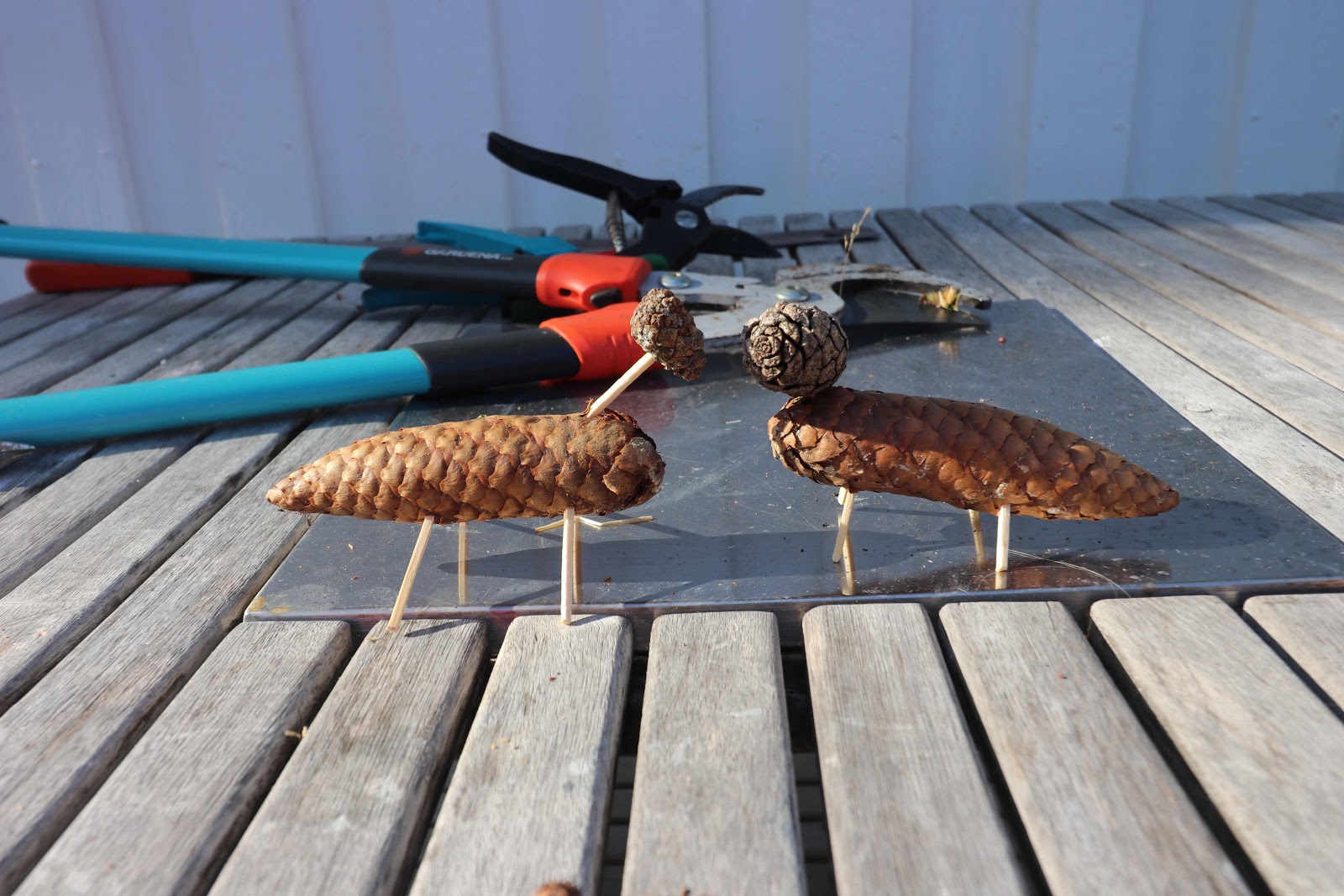 Farfar försökte introducera en ny lek med barnbarnet. Tanken är väl god att kunna använda föremål som växer ute i naturen och skapa och använda sin kreativitet för att se hur kor och hästar växer fram. Barnbarnet var nog mest intresserad av att köra skruvdragaren och några hästar och kor var det inte tal, nej barnbarnet skulle göra noshörningar. Det spelar väl ingen roll om det blir kor eller noshörningar men någon vidare lek med de nyskapade djuren blev det inte. Det skall nog till lite mer än kottar för att barn idag skall få utlopp för sin fantasi. Däremot skulle djuren absolut med hem när det var dags för hemfärd. Efter lekstunden utomhus så blev det lek inomhus och då var det ambulanser, helikoptrar och andra utryckningsfordon som var föremål för fantasin och leken.