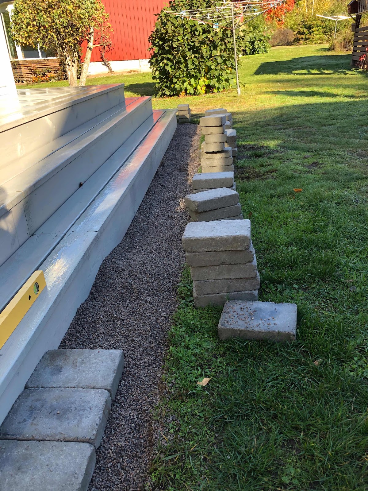 Vi har pausat grävandet av jordhögen ett på dagar i alla fall det mest intensiva grävandet, det har mest blivit några kärror hit och dit. Istället för arr köra jord har vi nu övergått till att bli stenläggare, för runt om hela altanen skall vi ha en kant med just det - kantsten. Strax innan lunch åkte vi bort och till Beijer och lastade en släpkärra full med sten och efter ett par timmar senare så var det klart, inte riktigt men nästan det saknades ett par stenar som vi får komplettera med. Jag la stenen och maken drog nya begränsnings linor till gräsklipparen och fyllde upp med jord runt omkring, så nu är det bara gräsfröna som skall sås. Fast det klart vi har väl 5-6 kubik jord som skall förflyttas till baksidan innan det är dags för sådd. Vi avslutade stenläggardagen med ett glas vin i uterummet och passade på att titta på ett tv program med favoritförfattaren Denise Rudberg, i dag blir det en lugn dag om benen får bestämma.