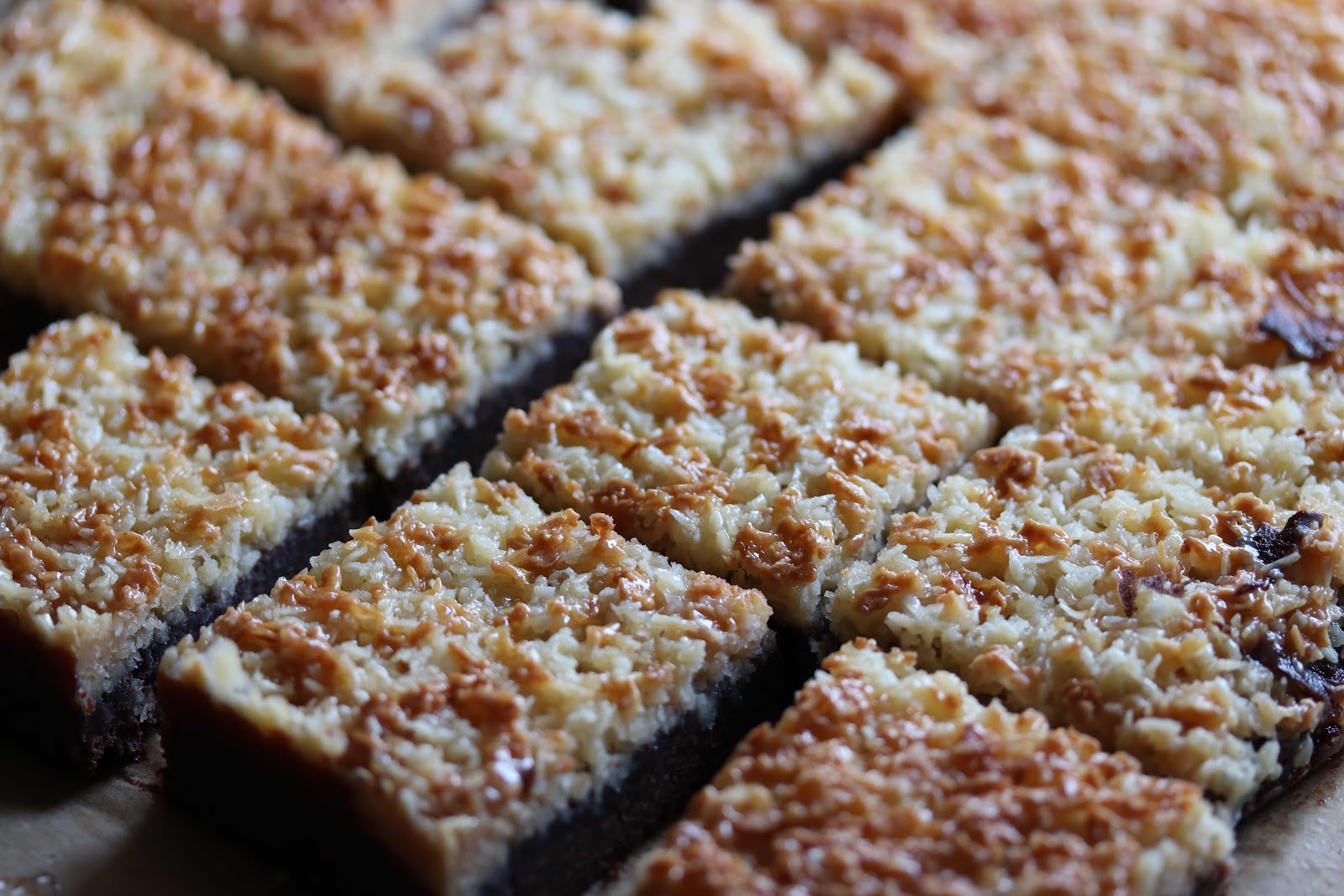 Fördela smeten över kladdkakan och grädda sedan ytterligare 10 min eller tills toscan fått en gyllenbrun färg. Ta ut kakan och låt den stelna och sätt in den i kylskåpet så att den blir riktigt kall skär sedan kakan i rutor