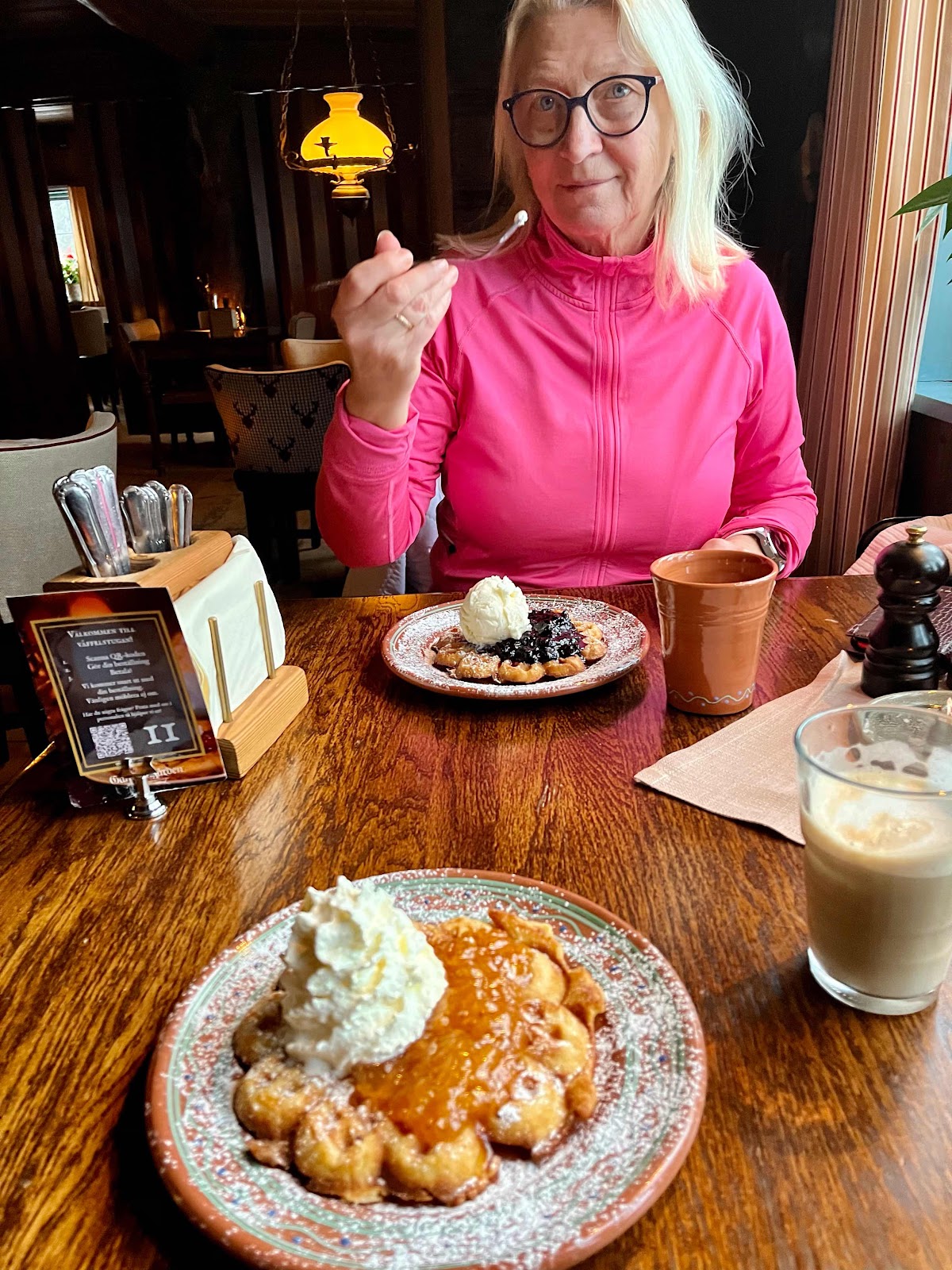 Efter en ordentlig tur på skidorna med fina spår men lite små trögt pågrund av de små fjäderlätta snöflingorna som dalade ner och la sig som ett täcke i de kalla spåren. Vi kände väl att energidepåerna började dippa så det var bara att leta upp första bästa våffelstuga. Vad kan passa bättre än Gammelgården där man kan njuta av fantastisk goda våfflor. Jag fråga naturligtvis efter receptet men fick till svar att tyvärr det är ett hemligt recept så det blev inget med det. Vi valde en våffla med hjortronsylt och grädde och en med blåbärssylt och glass. Det var två fullträffar på de båda våfflorna. Det är knapp man kan tro att man kan bli så mätt efter att ha fått i sig en våffla men vi tog och hem och ramlade ner i soffan för lite extra återhämtning.