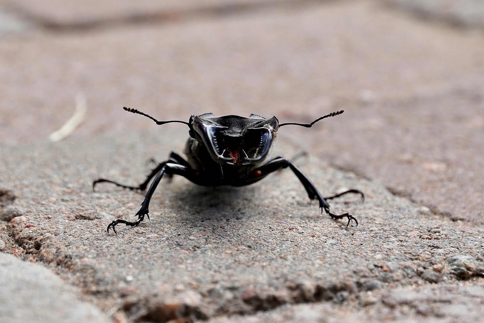 Hade vi levt för sisådär 230 miljoner år sedan hade vi kanske fått möta den här typen av gigantiskt stora djur som hade trampat runt på vår planet. Varje steg av dessa jättar hade säkert fått jordmassor att vibrera och skallra. Som tur är så lever vi varken under den tiden eller möts av skräckinjagande människoätande baggar. Fast kryper man lite närmare med kameran så är det inte utan att fantasin skenar och en liten förnimmelse av svunna dagar väcks till liv. Men nu behöver ni inte vara oroliga det är bara en liten skalbagge som har kommit lite för nära linsen på kameran. Skalbaggen som dessutom är Blekinges landskapsdjur finns rikligt av här på Öland och i går landade den här baggen på vår infart, jag vet inte om det var mina röda träskor som var av intresse eller om det var något annat som lockade. Jag läste att ekoxen även har andra mer eller mindre vanliga namn såsom hjortbagge eller som på Gotland honnbagge. För att vi inte skulle trampa på den här fridlysta baggen lyfte jag in den i lämpligare terräng än på en stenbelagd garageuppfart.