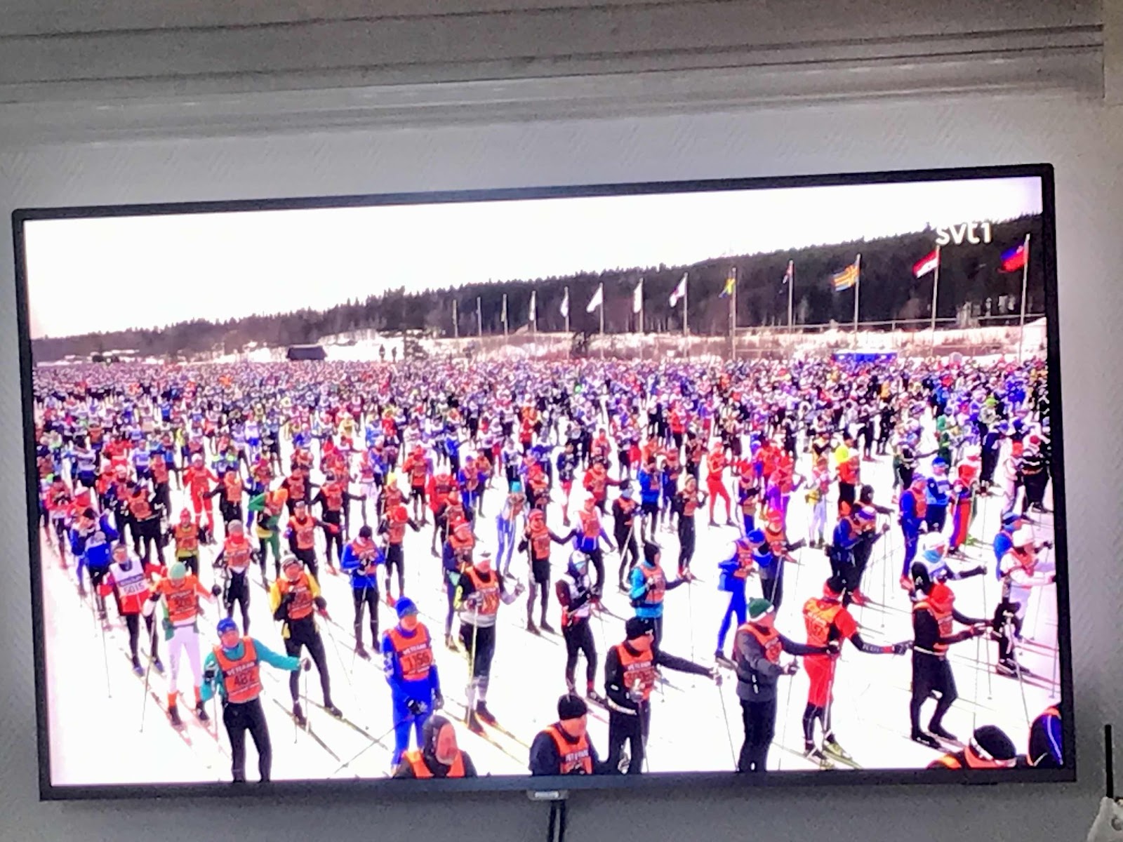 Ja så var det då dags för första söndagen i mars och det vi väl alla vad det betyder, just Vasaloppet. I år får vi njuta av starten från TV-soffan förra året stod maken och jag vid sidan och såg hur detta myller av skidåkare forsade fram. I år är det 15000 entusiaster som skall ta sig de 9: milen från Sälen till Mora , det snöar visst lite och temperaturen ligger på -5 grader. Det är lite spänning i luften trots att man följer hela evenemanget från ett varmt hus med kaffekoppen i högsta hugg. Och brasan som sprakar till tonerna av tv kommentatorerna. Sonen skulle stått på på startpallen i år men en ilsken bacill satte stopp för hans medverkan, vi hoppas naturligtvis att vi kan heja fram honom nästa år.