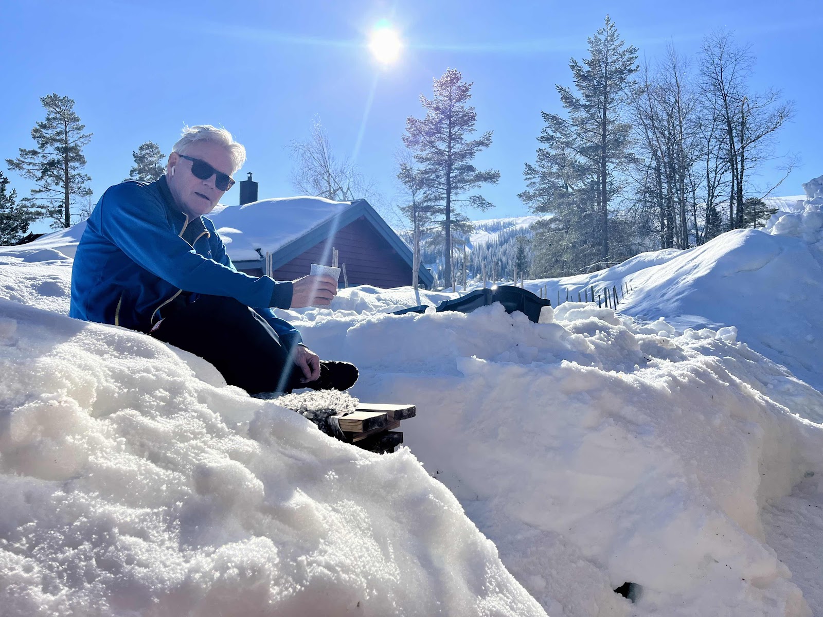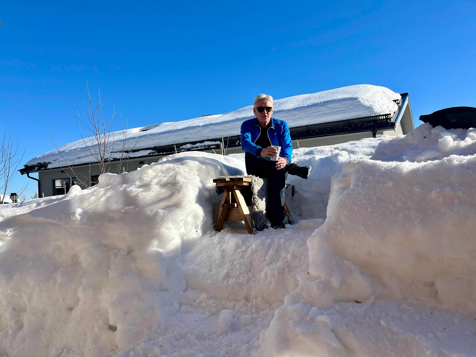 Det är inte utan att man längtar efter solen och dess underbara strålar. Perfekt väder minusgrader på natten som fryser spåren och på dagen tittar solen fram och ger perfekta förutsättningar för skidföret. Fast det är rätt gött att skotta fram altanen och sätta fram en pall eller solstol och bara vända ansiktet mot solen och njuta. Jag hörde själv att det lät väldigt enkelt att bara skotta fram altanen och sätta sig. Vi har säkert tre meter snötäcke på vår altan så det är verkligen ett tidsprövande arbete att få bort en liten plätt. Vi gjorde iordning en liten avsats mitt i snön med utsikt utöver backarna där vi även kunde njuta av en kopp kaffe, vad mer kan man begära av livet. Jo säger maken som nu i över en vecka har trilskats med en envis förkylning som inte vill ge med sig, den skulle han absolut vilja bli av med och det bums.