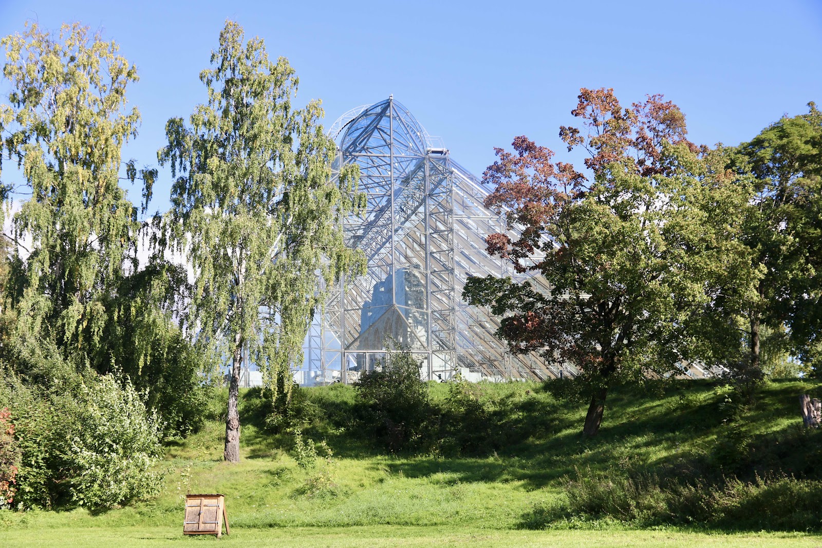 Från vikingaskeppet tog vi oss vidare Domkirken eller rättare sagt det som var kvar av den gigantiska kyrkan som byggdes 1152/53 med kalksten från närområdet. Kyrkan byggdes ut på 1300 och 1400 talet. Vid reformationen 1537 miste Domkyrkan i Hamar sina rättigheter till Domkyrka och kyrkan miste både status och sin glans dagar. 1538 var kyrkan i så dåligt skick att man funderade på att riva den men domkapitlet sökte om pengar för att restaurera den som då ansågs vara en av Norges vackraste kyrka. Kyrkan renoverades, men 1567 var vi svenskar där och härjade och sprängde den vackra kyrkan med krut. 1998 invigdes den gigantiska glasbyggnaden över ruinerna av kronprins Haakon, glasytan består av 4800 kvadratmeter glas monterad på en stålkonstruktion som skapar ett vackert hölje öve ruinerna som är kvar.