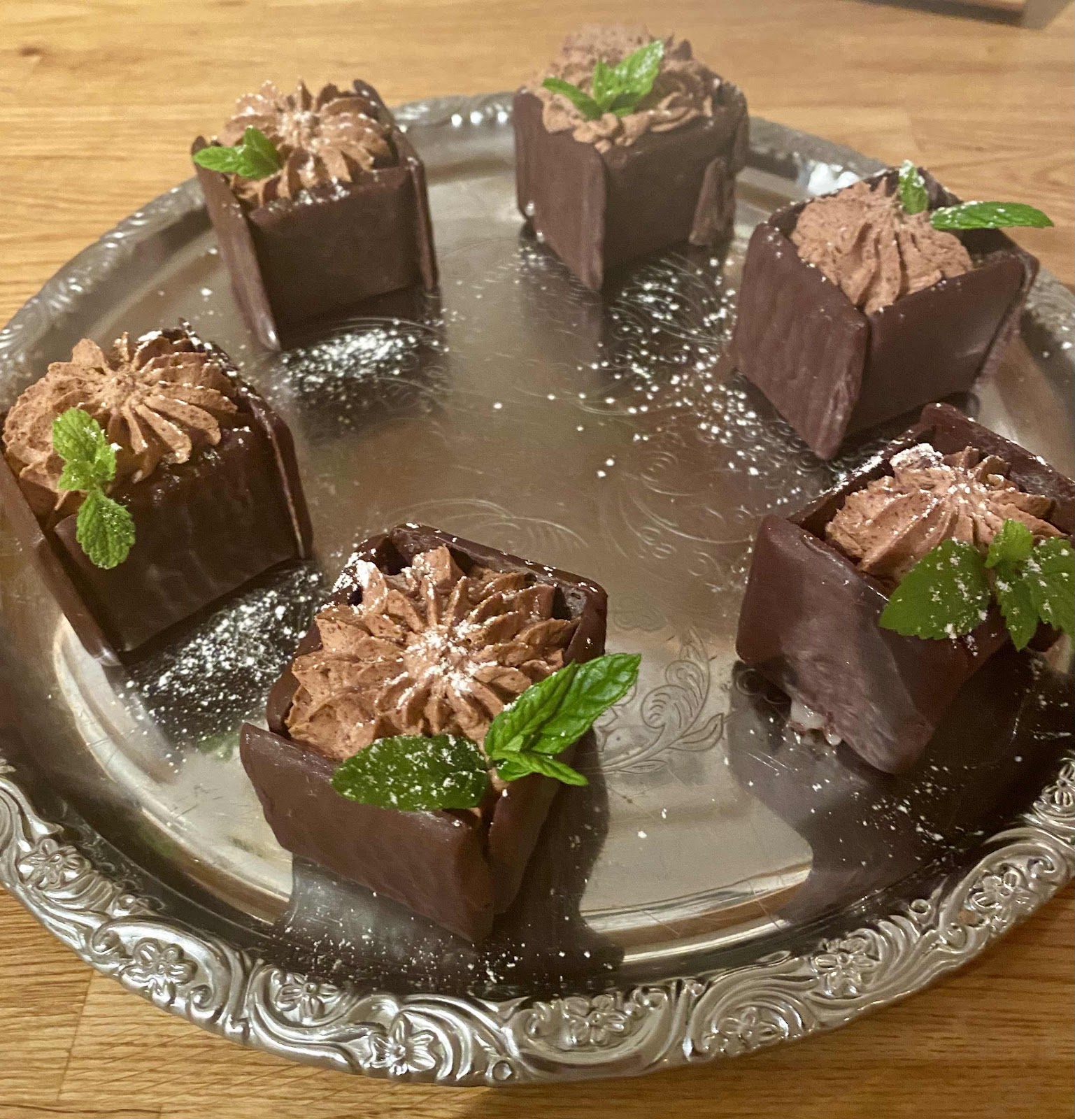 Det här receptet har jag haft i mina gömmor läng men det har aldrig blivit av att jag gjort dem, men nu skulle vi ha lite besök så då tänkte jag att nu är det väl dags att knåpa ihop de här små söta lådorna av After Eight skivor. Det var inte utan att tålamodet prövades både och två gånger innan boxarna fastnade och satte sig istället för att helt fallera och bli liggande trianglar men sagt och säkert så fick jag ihop små lådor som kan fyllas med vad man nu vill. Jag fyllde mina med  choklad mousse men jag kan tänka mig att det skulle smaka gott med hallon mousse. Numera finns det After Eight i olika smaker så det gått nog att kombinera ett antal smaker. Resultatet blev helt ok även om den där moussen kan bli lite väl mastig, men jag är glad att jag provade att göra dem innan receptet faller i glömska.
