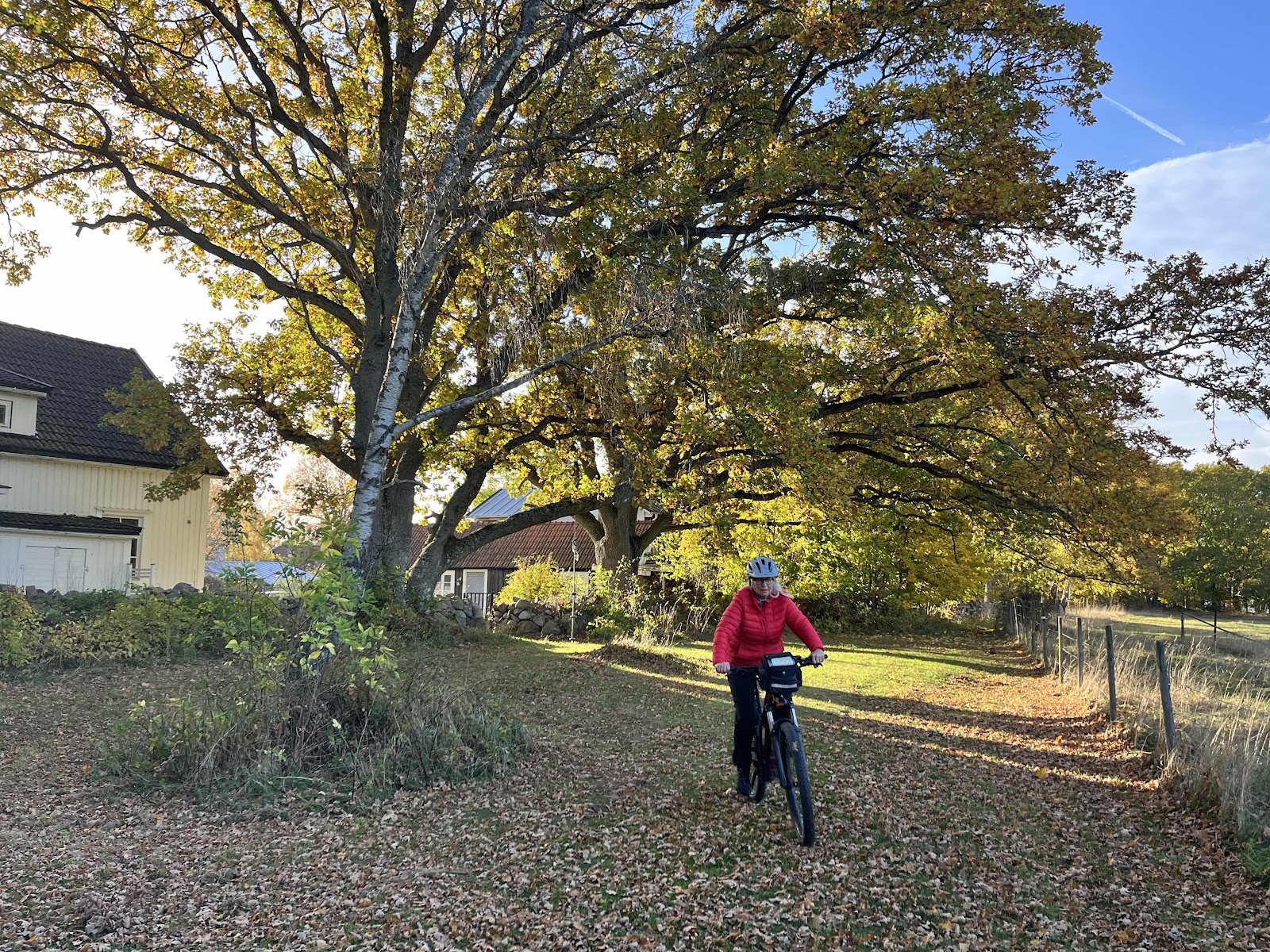 I dag är det en riktig höstdag och  vi förlorar ca 4 min solsken fram till den 21 december då det är vintersolstånd som är årets kortaste dag. Nu gäller det att ta vara på dagen och få så mycket dagsljus det bara går och passa på att vara ute i skog och mark och njuta av färgprakten i bland lönn och bok. I går passade vi på att njuta av solskenet och den ljumma vinden för ni hörde väl på Per-Erik vår stora väderguro på SVT att Kalmar hade 17,7 grader i går. Vi hade i vanlig ordning pälsat på oss för ordentligt för enligt en annan app blåste det kuling men vi hade lika gärna kunnat cykla i T-shirt. Vi var lite oeniga om vilken rutt vi skulle cykla så därför tog vi den lite längre sträckan så att vi verkligen kunde frottera oss i singlande löv utmed havet innan vi stannade till i Stora Rör och fick i oss en kopp kaffe och en väldigt god mazarin.