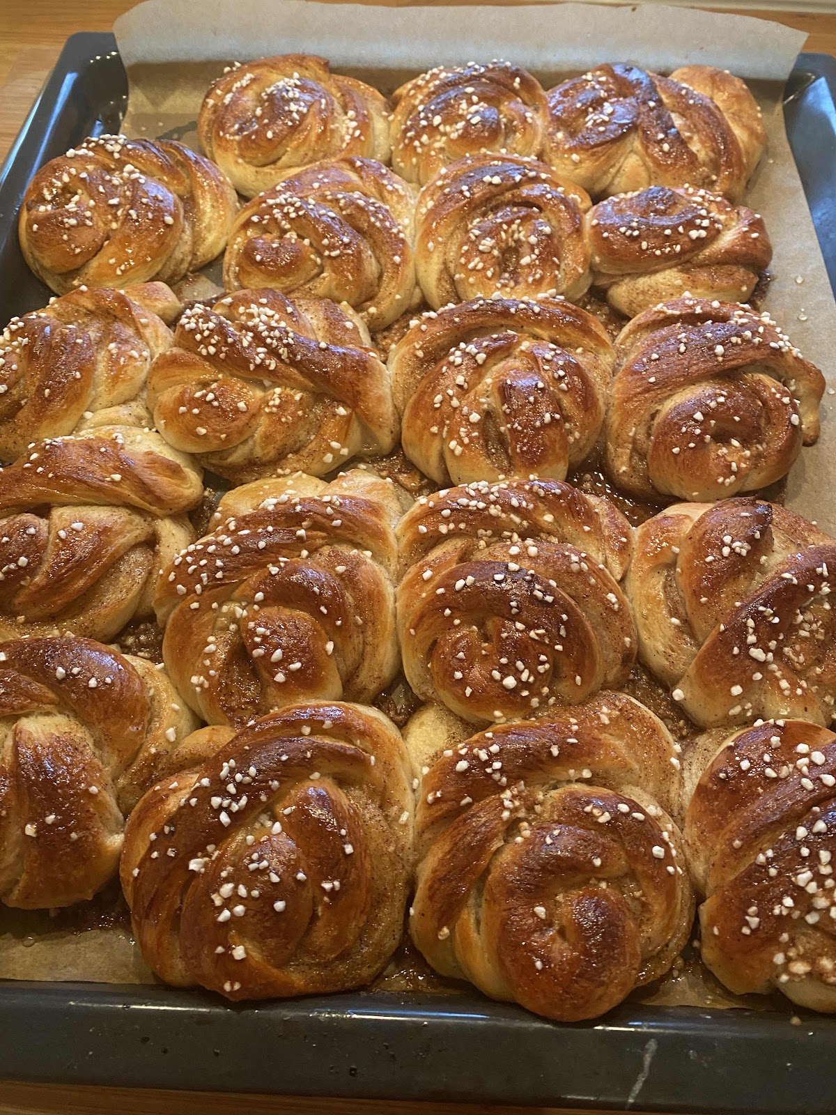 I dag firar hela Sverige kanelbullens dag och så gör vi svenska alltid den 4 oktober varje år och har gjort det sedan 1999 då kanelbullens dag instiftades av Hembakningsrådet för att uppmuntra fler att baka och njuta av just kanelbullar. Jag tror att det är många arbetsplatser som passar på att fira lite extra till eftermiddagsfikat och köper lite härliga bullar från något bageri. Självklart är det en stor dag för både bagerier och caféer och uppskattningsvis säljs det ca 7-8 miljoner bullar. Jag bakade mina bullar i går så att det allt skulle vara redo för dagens firande, jag fick även påhälsning av två bullsugna killar i går, de såg lite besvikna ut när jag påpekade att det inte var förrän i morgon som det är dagen d för bullfest, men desto gladare blev de när jag sa att det var ok att tjuvstarta en dag tidigare. Härom dagen var vi på IKEA och skulle byta en rullgardin och då passade vi på att köpa kanelbullar i halvfabrikat det var bara att sätta in dem i ugnen, ja de var faktiskt goda de också.
