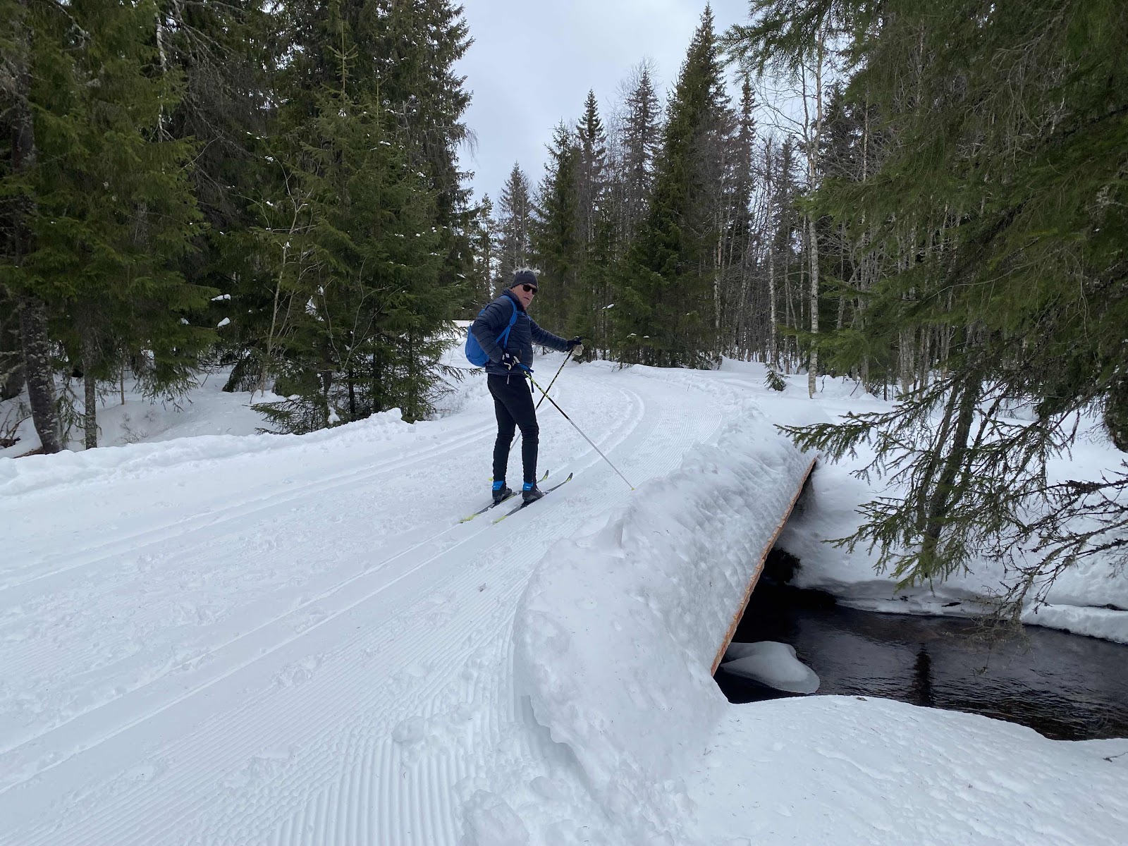 Det töar och blåser halv storm men det är inget som varken berör eller påverkar skidspåren uppe i Sälen. Vinden sätter lite käppar i hjulen för slalomåkarna då liftarna stängs pga av hård vind, det har varit 20 m/s i byarna så det gäller verkligen att hålla i hatten. Det var faktiskt så att det gällde att hålla sig stadigt i spåren för även ute på de öppna fälten tog vinden i ordentligt. Vi tyckte att det gick väldigt bra när vi skidade åt det ena hållet men när vi skulle tillbaka så var det något helt annat, då fick vi mota hela vägen, men som tur var så hittade vi ett litet vindskydd där vi kunde fylla på energiförrådet , därefter var det bara att skida vidare i fantastiska spår i Gubbmyren.