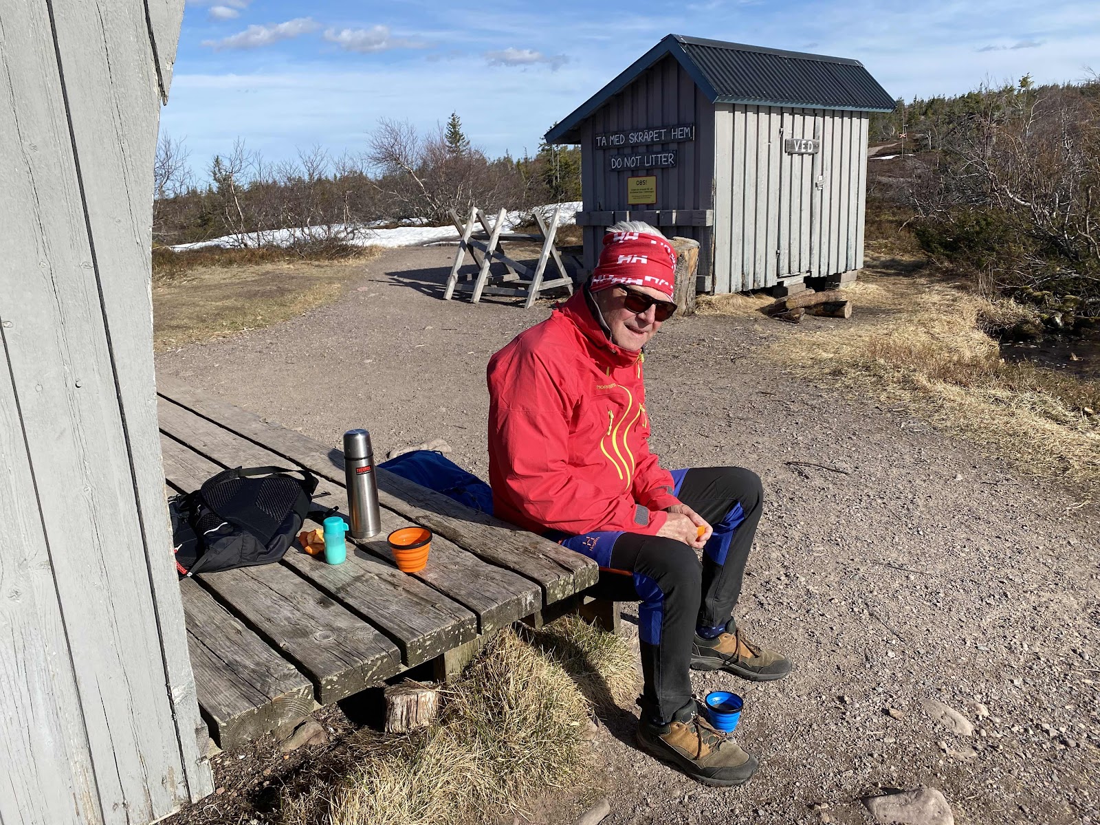 Solen strålade men visst det var lite blåsigt när vi hastigt och lustigt blev lite sugna på att ta oss upp för Östfjället i Sälen. Kaffet kom i termosen men någon större sensation till fikat blev det inte men en frukt kunde vi njuta av när vi väl passerat de första fyra kilometerna. Det finns en liten sjö på toppen av östfjället eller närmare bestämt en liten tjärn - Östfjällstjärnen som är så inbjudande till bad, kanske inte just nu men på sommaren en riktig fin dag så får det nog bli ett dopp i den där tjärnen. Efter fikapausen i blåsten så var det bara att promenera på spången ner mot Högfjällshotellet. Även om det blåste lite rejält så var det tystnaden och den porlande bäcken som vi gick utmed som gav lugn i själen, det är vackert där uppe i fjällen även off season.