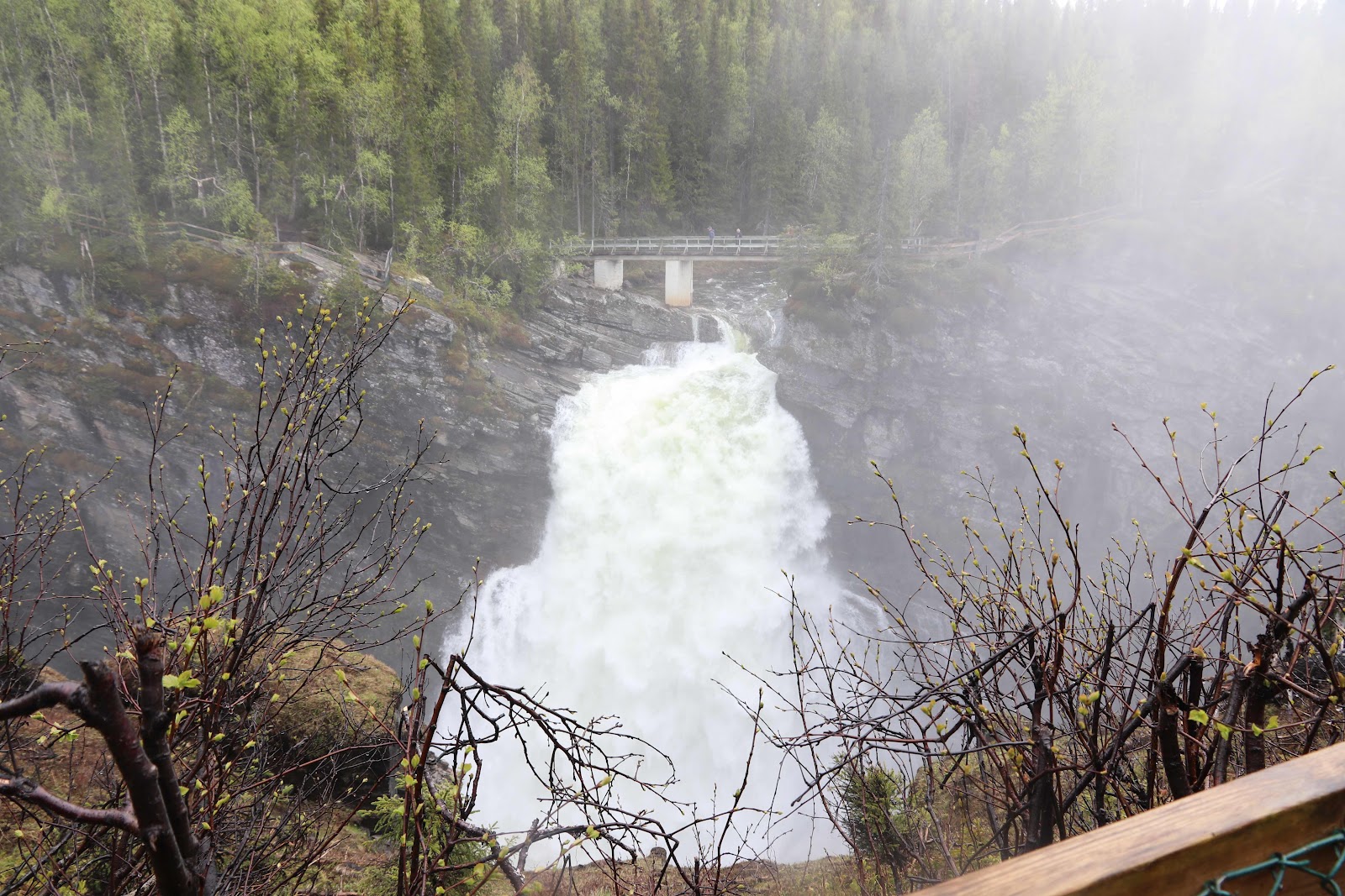 Sista vattenfallet på resan Hällingsåfallet utanför Gäddede är ett dramatiskt fall, Hällingsån kastar sig ner 42–43 meter och mynnar i Sveriges längsta vattenfyllda kanjon, hela 800 meter lång. När luftfuktigheten är hög bildas dimma och ofta regnbågar i forsdimman, vilket bidrar till det nästan magiska ljuset och känslan. Området är skyddat som naturreservat och Natura 2000‑område och hyser ovanliga mossor och lavar som trivs i det fuktiga mikroklimatet. En bred, välspångad gångväg leder från parkeringen till en utsiktsplattform ovanför fallet så står det i faktarutan, men om stigen är så välspångad var väl lite si och så men helt klart värt ett besök.Om man väljer att besöka Hllingsåfallet under vintern sägs det att fallet bildar imponerande isskulptur och bäddar in kanjonen i kristall. Ljudet är fullkomligt öronbedövande, när vattenmassorna kastas ut för den branta bergväggen. Hällingsåfallet räknas som det fjärde högsta vattenfallet i Sverige och bjuder på en spektakulär upplevelse året om .