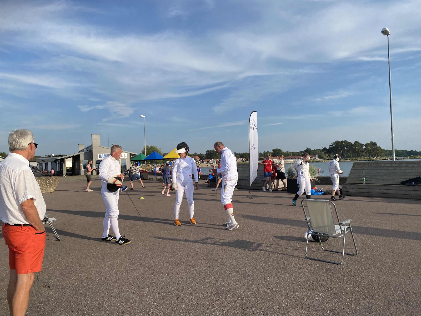 Det brukar vara fullfart i hamnarna på sommaren och Färjestaden är inget undantag. Från restaurangerna sprider sig den ena ljuvliga doften efter den andra och från någon strömmar toner från live musik. Så med andra ord är det inte bara Borgholm som kan ståta med liv och rörelse utan även min kommuns störta tätort Färjestaden. På hamnplan är nu biltrafiken avstängd så folk kan flanera hur som helst och ev köpa ett glas jordgubbar med Nutella eller en glass om andan faller på. När vi var där för några dagar sedan höll Kalmar fäktklubb på att rigga för aktiviteter och det var nog så att man kunde få svinga en värja om andan skulle falla på. Båtlivet var också i full gång och gästhamnen var i stort sett full av båtar från när och fjärran som vi njuta av en magisk solnedgång över sundet.