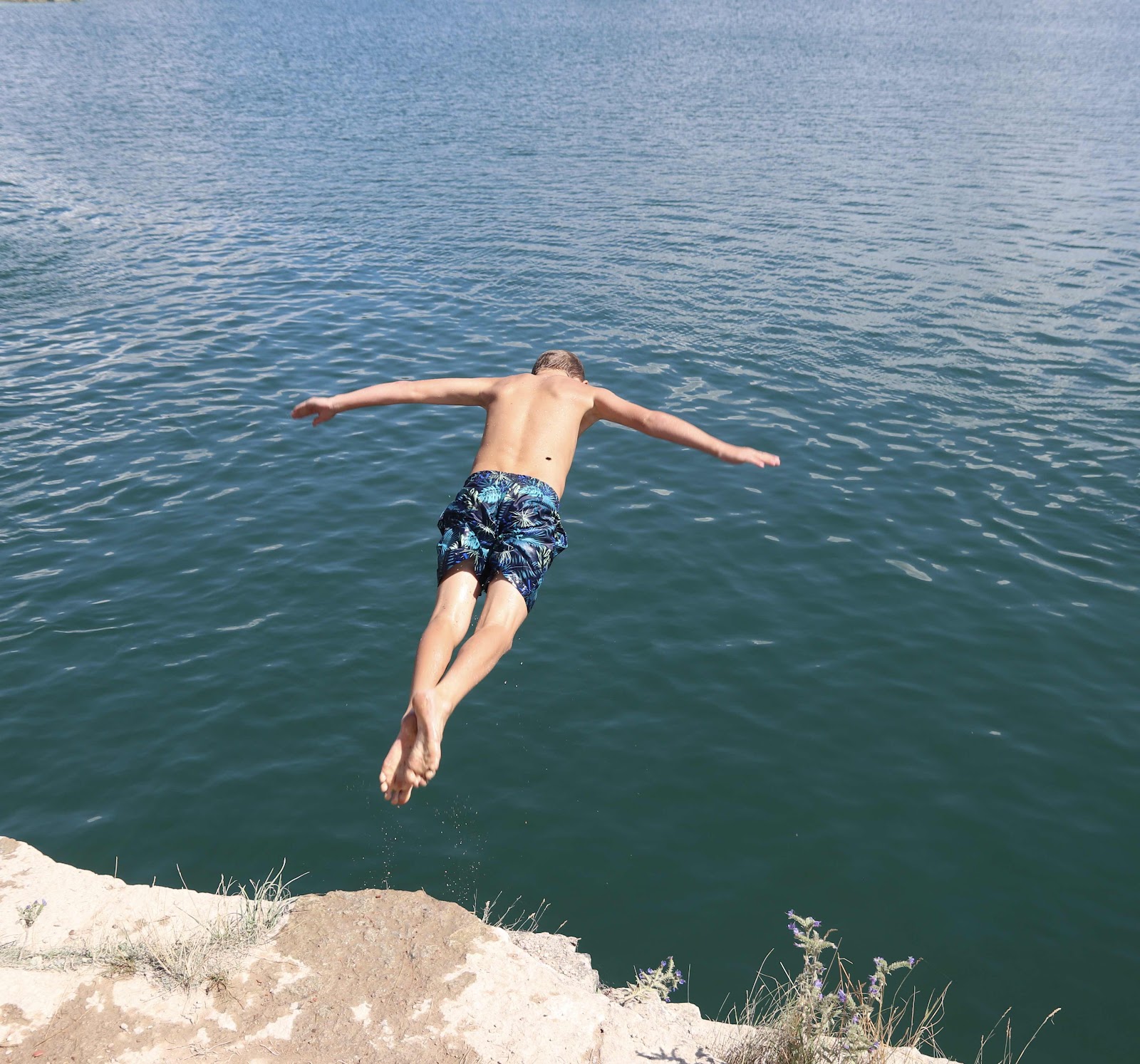 Parkeringen strax intill väg 136 bågnade av bilar och då var vi ändå där ganska tidigt. Idag skulle det bli bad och inte vilket bad som helst utan i det snart världsberömda stenbrottet här på Öland. Det låter kanske lite märkligt men det är inte utan att även jag som är badare i havet gillar stenbrottets kalkrika vatten.Kalkbrytningen var tidigare en viktig näring på ön, och brottet speglar Ölands geologiska och industriella historia. Grönhögens stenbrott representerar miljarder år i bergformation – med väggar upp till 17 meter höga, där varje millimeter sten motsvarar ungefär 1 000 år, och utför de väggarna hoppas det flitigt ner i det vackra blå vattnet. Det är 12-14 meter djupt utmed väggarna och för övrigt ca 4-9 m djupt beroende på säsong. Det kanske inte är så mysigt att ligga och sola där mitt i kalkbrottet men ack så roligt att hoppa och dyka både för stora och små.
