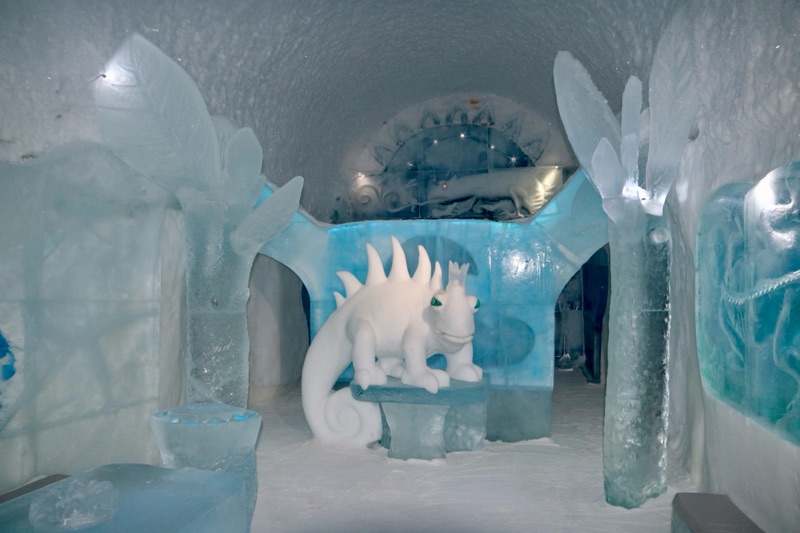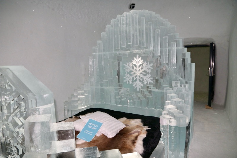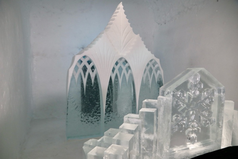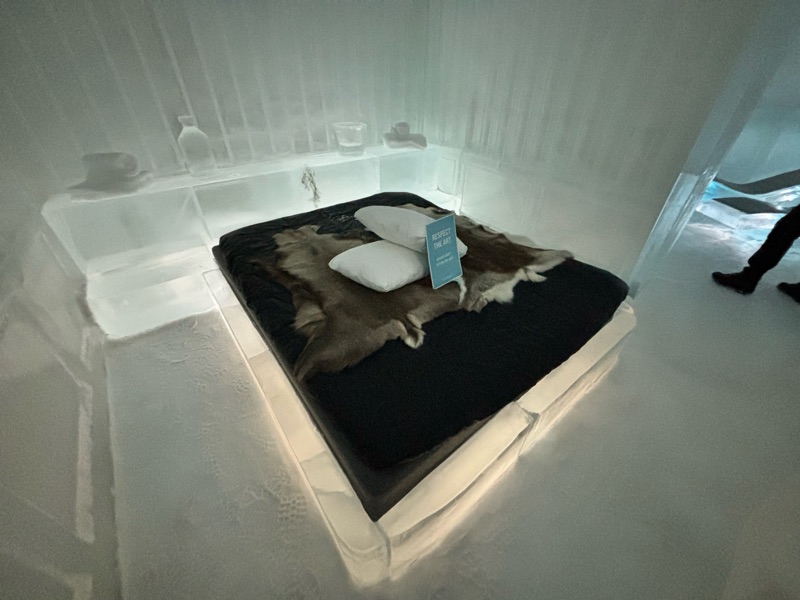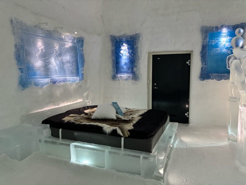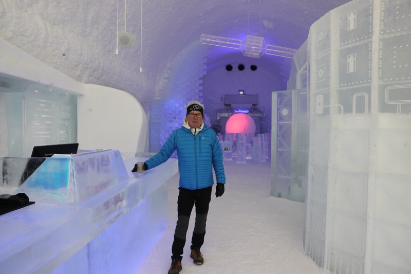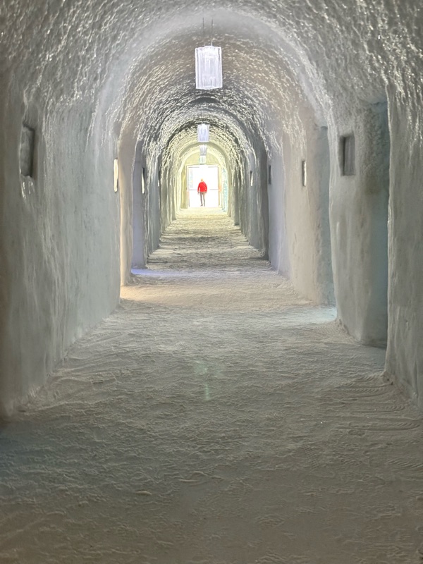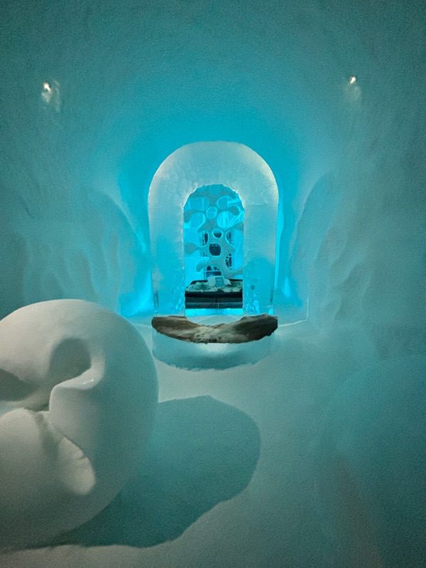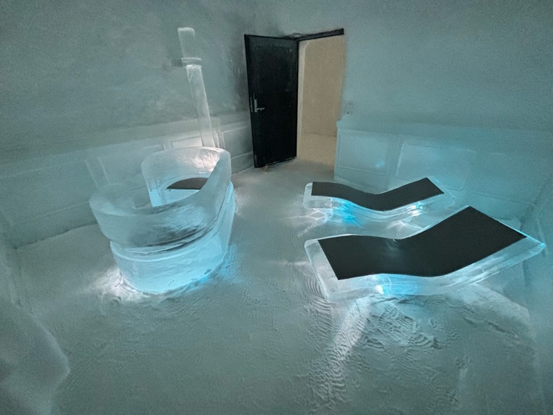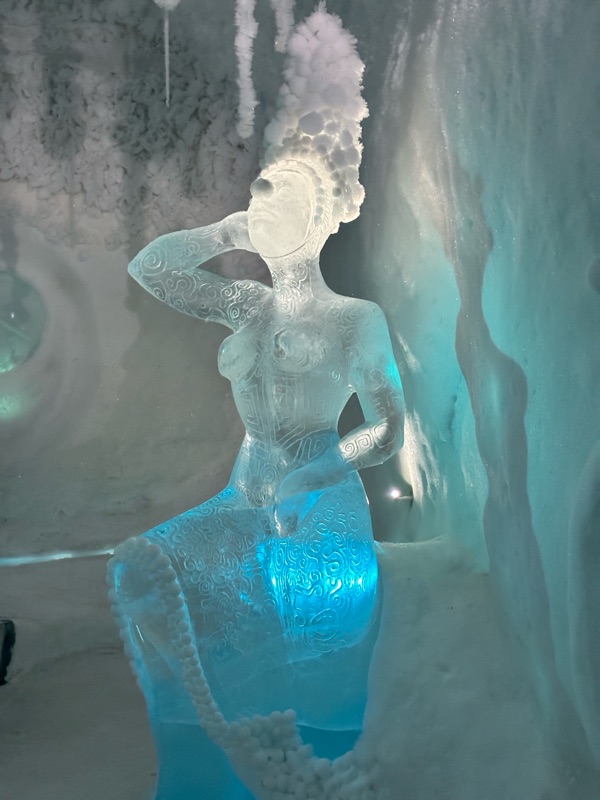 I det gnistrande vintermörkret, där norrskenet dansar som gröna slöjor över himlen, reser sig Ishotellet i Jukkasjärvi ur snön som ett fruset sagoslott. Varje år föds det på nytt ur Torneälvens kristallklara is, skapat av konstnärer från hela världen. Väggarna skimrar i blått och silver, och tystnaden där inne känns nästan helig. Sängarna är huggna ur isblock, bäddade med renfällar och sovsäckar som håller värmen kvar i kylan. Ljuset bryts i isens yta och förvandlar varje rum till ett glittrande konstverk. I isbaren serveras drinkar i glas av is, och utanför väntar hundspann, midvinterkyla och stillhet. När våren kommer smälter hotellet långsamt tillbaka till älven, som om det aldrig funnits. Tyvärr fick vi inte uppleva detta gnistrande ögonblick för Torneälv har inte frusit ännu så det blev besök i den kalla isolerade delen, så det kändes ganska skönt att komma ut i värmen igen, värme och värme allt är relativt men 8 grader varmt var det ut. Men minnet förblir — ett förtrollat ögonblick fångat i is.