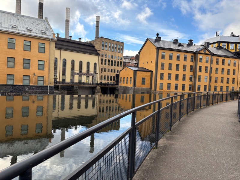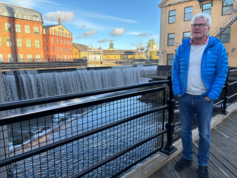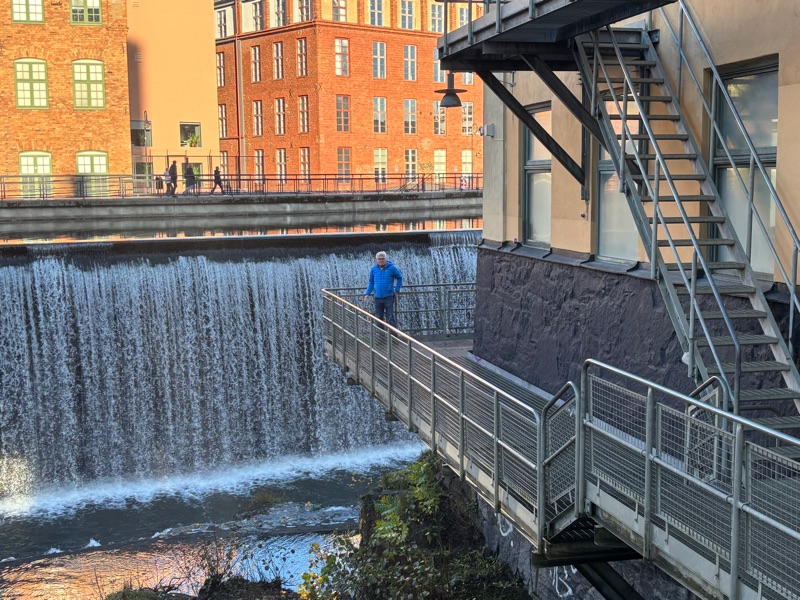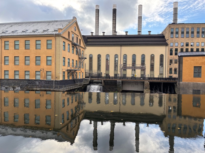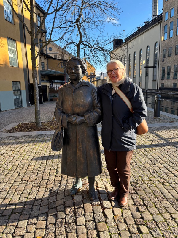 I stället för att stanna vid ett tråkigt köpcenter och ladda bilen åkte vi in till Norrköping. Jag behöver stanna och röra på mig med jämna mellanrum, så den här gången tog vi oss till Arbetets museum. Vid den brusande Motala ström står fabrikerna som ett minne av en tid då maskinerna sjöng och fabrikerna andades liv. Det gamla industrilandskapet speglar sig i vattnet, där ljuset dansar mellan tegel och stål. Utanför står tanten i handväska och kappa, stolt och stilla – ett monument över alla de kvinnor som slet i vävens rytm, hon blickar mot strömmen, där historiens kraft ännu rinner. Här möts arbete och drömmar, slit och släp i samma andetag. Norrköping viskar – “glöm inte dem som byggde vår framtid.”